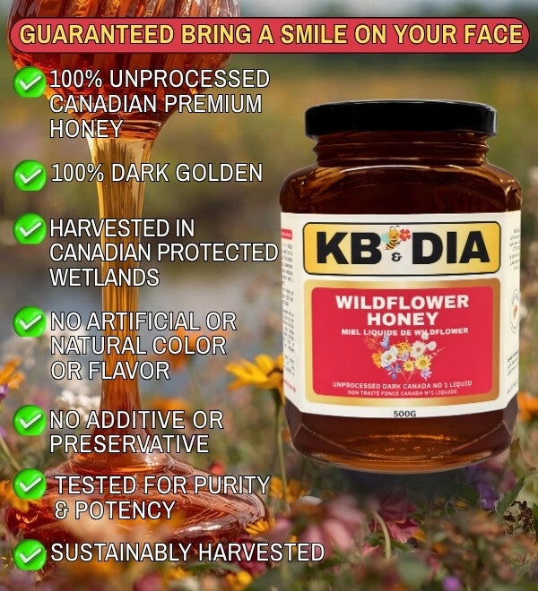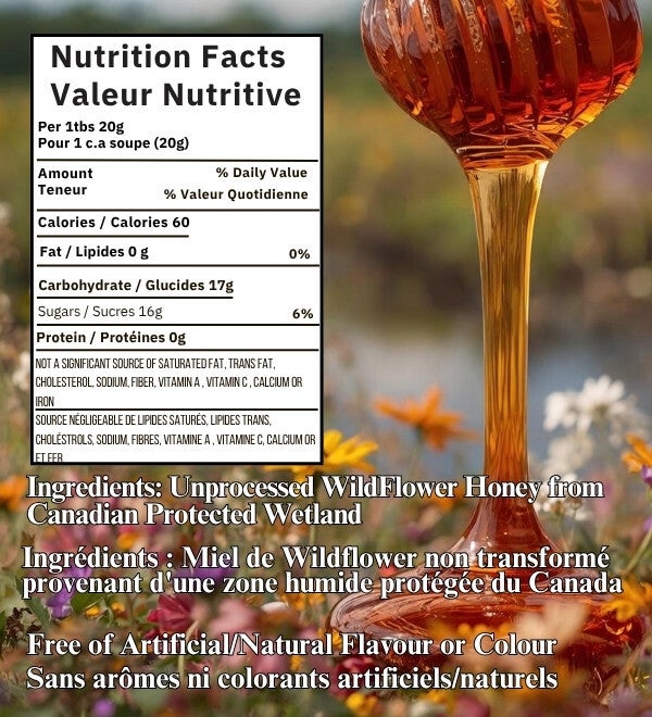 - OUR CANADIAN PROMISE: We are committed to sustainable, local beekeeping practices within Canadian protected wetlands, ensuring the purity and integrity of every jar. We stand by the superior quality and robust flavour of our Raw Wildflower Honey with a full satisfaction