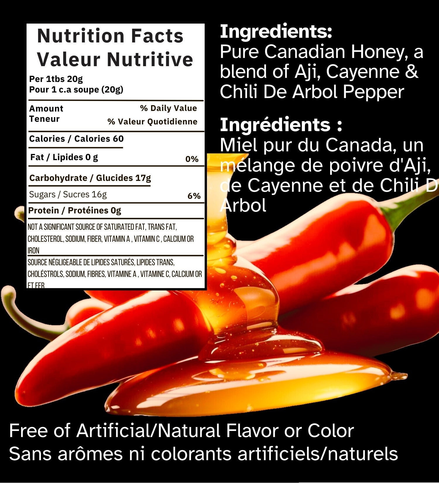 Hot Honey | 100% Canadian Pure Natural Raw Honey with Aji, Cayenne and Chili De Arbol Pepper | Honey with Chilies 375G