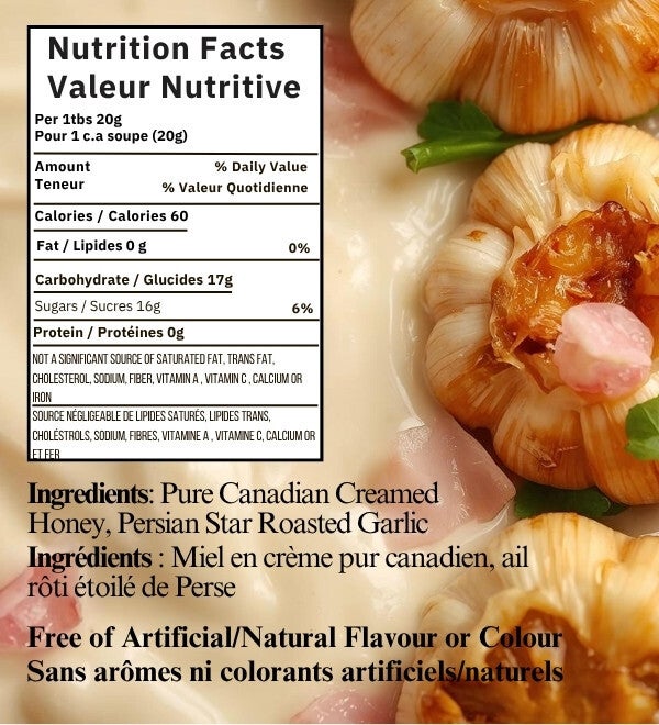 Ingredients: Pure Canadian Creamed Honey, Persian Star Roasted Garlic