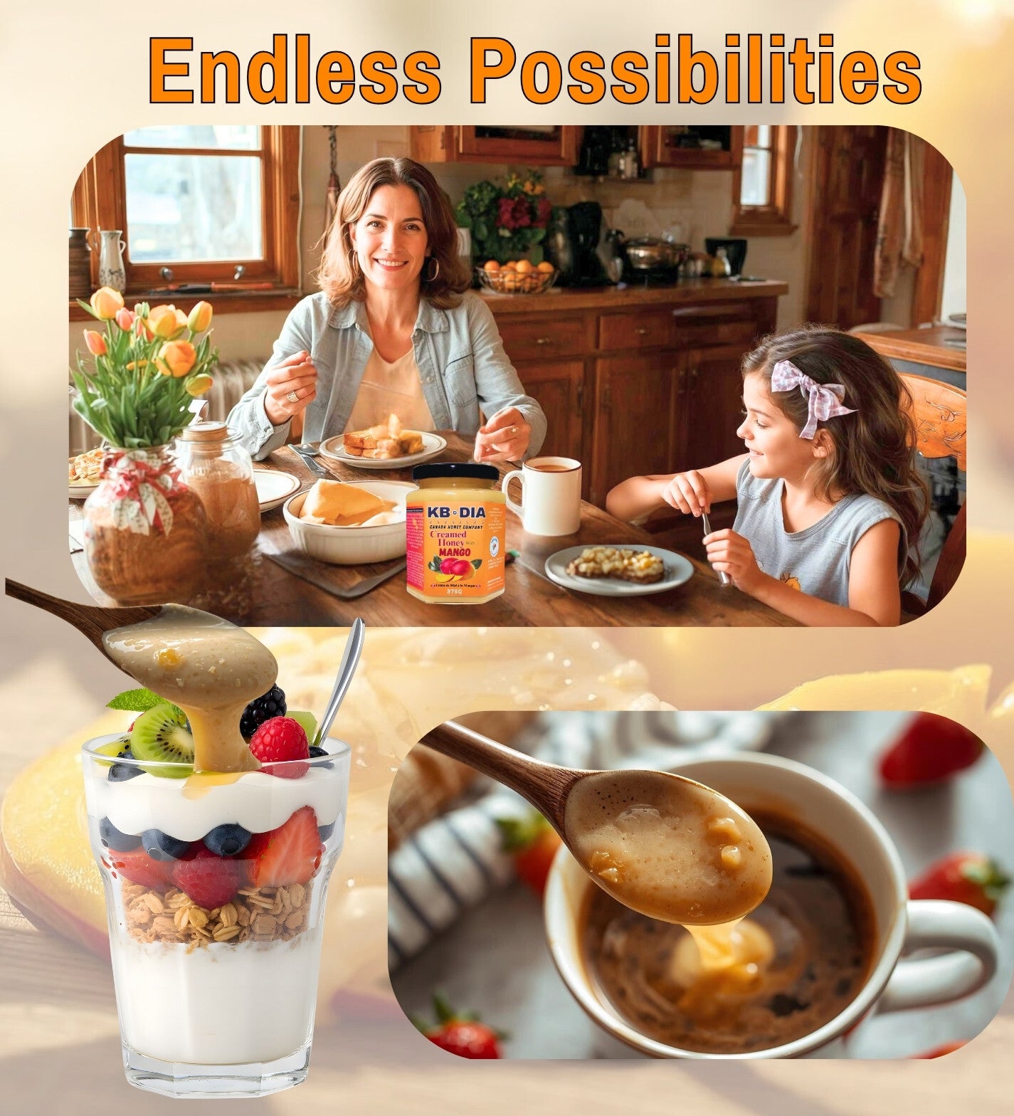 - INFUSED WITH REAL MANGO: Enjoy the delightful, tropical fusion of smooth, rich honey and sweet, real mangos. Our unique blend creates a perfectly balanced spread without artificial flavors or colors.