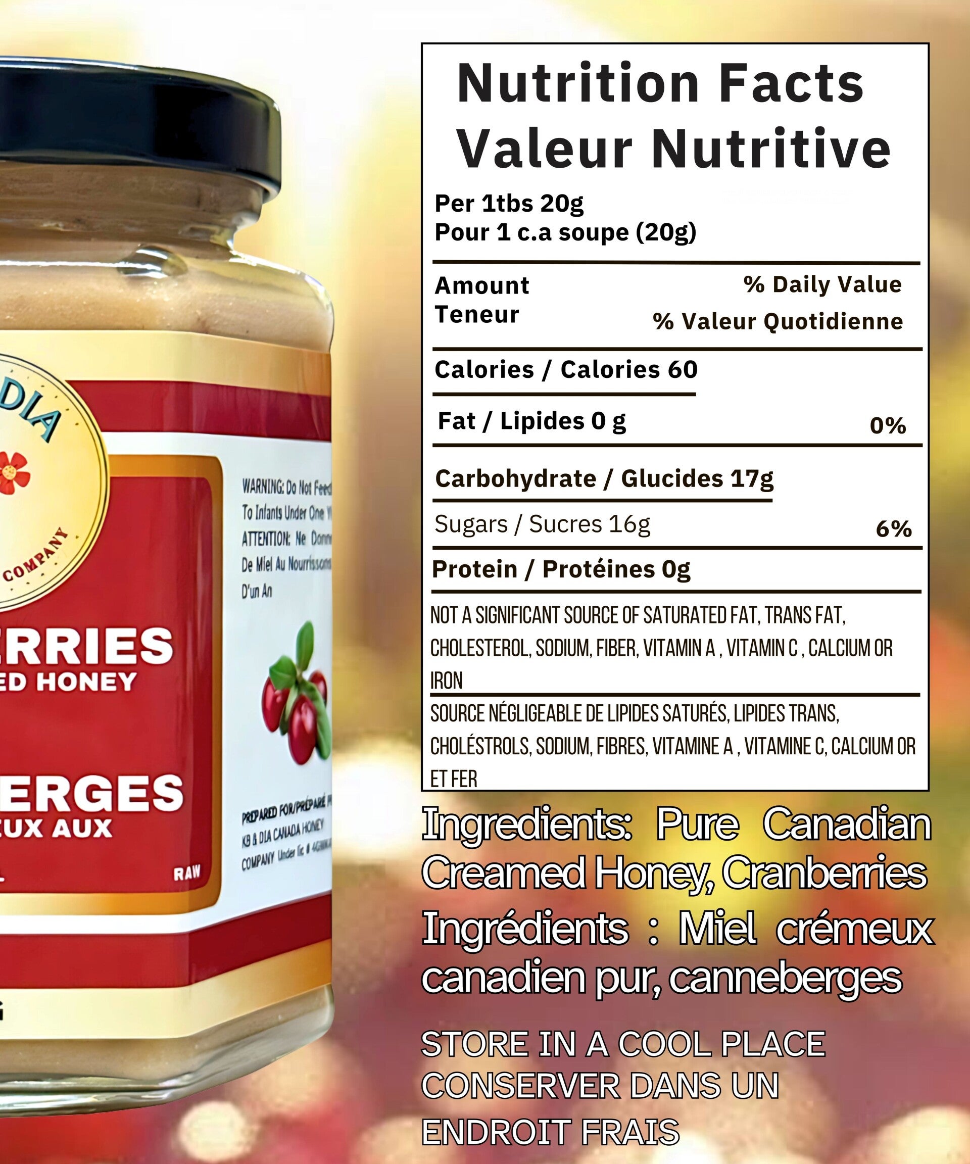 - NATURAL BLEND: Unique combination of creamed Canadian honey and Cranberries, offering a delightful fusion of sweet and tangy notes of Cranberries