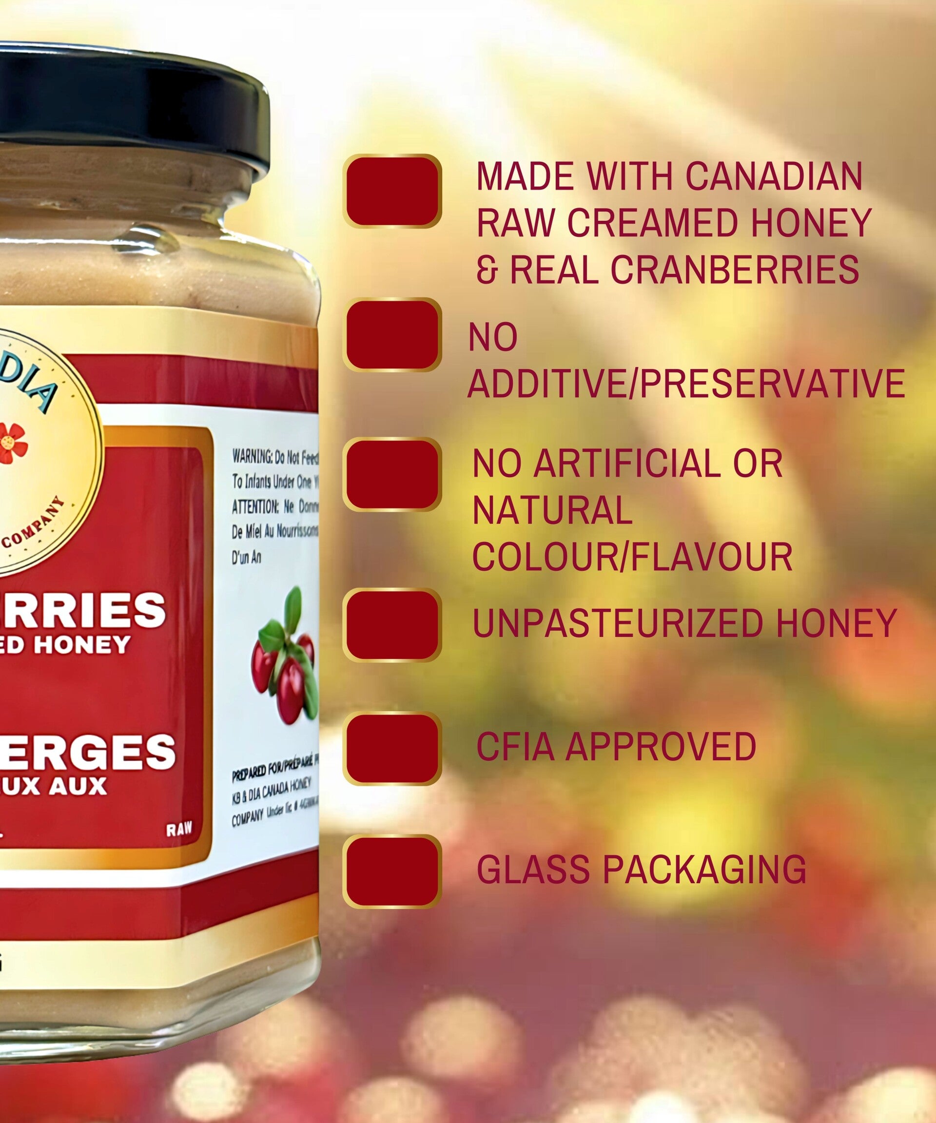 Cranberries Honey | 100% Canadian Pure Natural Raw Creamed Honey with Real Cranberries | 375G